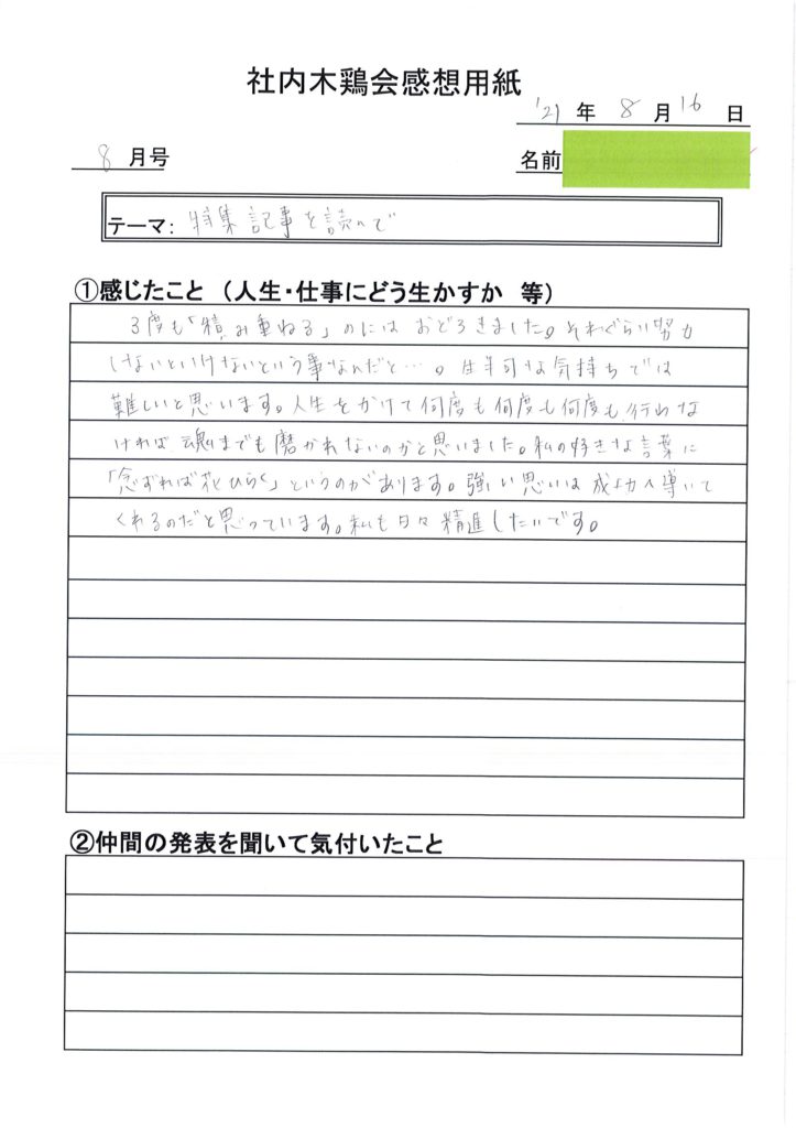 8月の社内木鶏会も、コロナの影響で感想文のみの提出となりました。