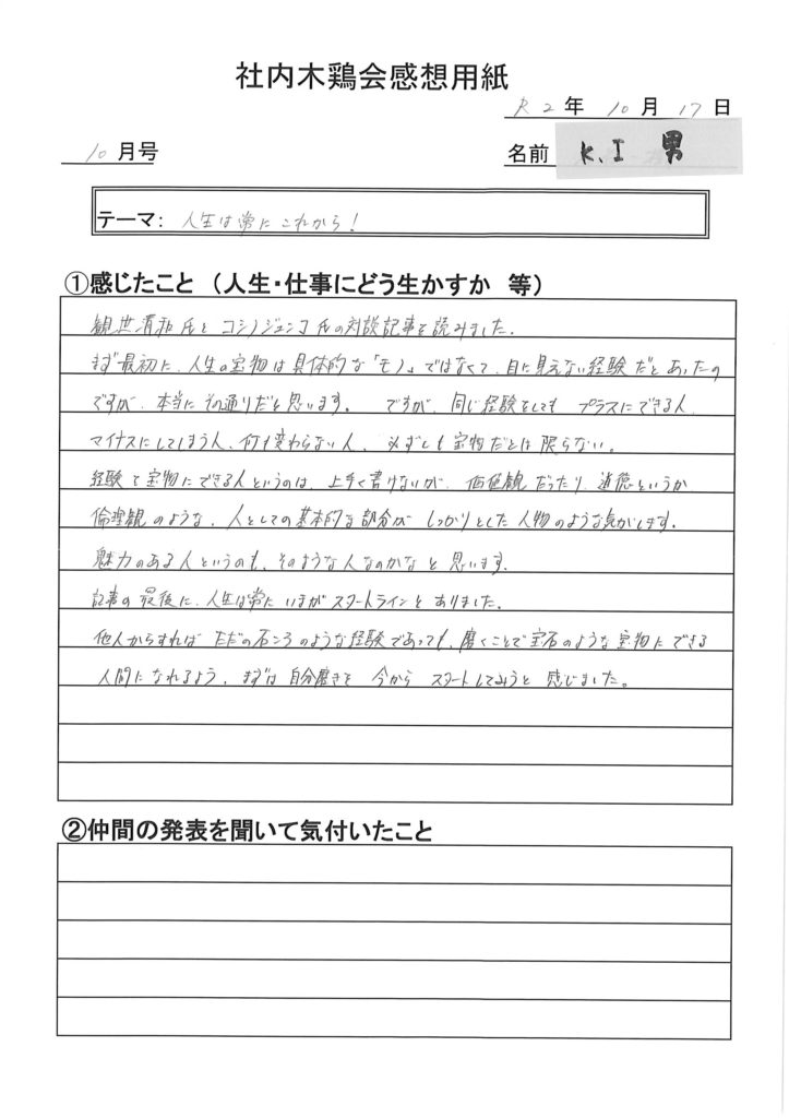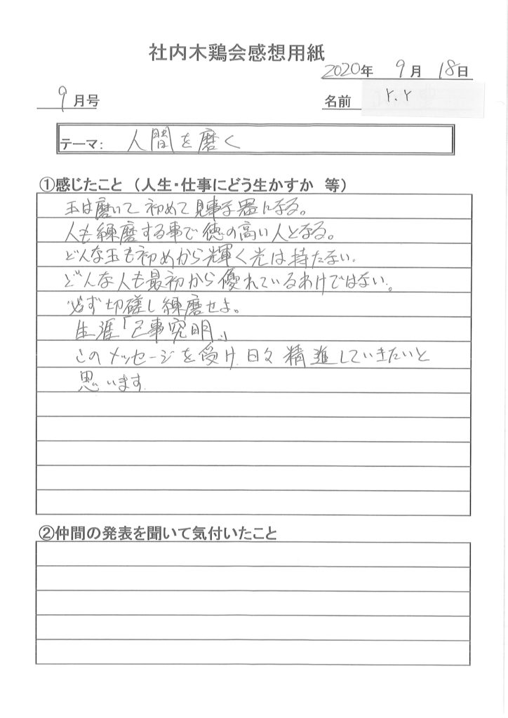 9月に続き、10月の社内木鶏会も感想文のみの提出となりました。