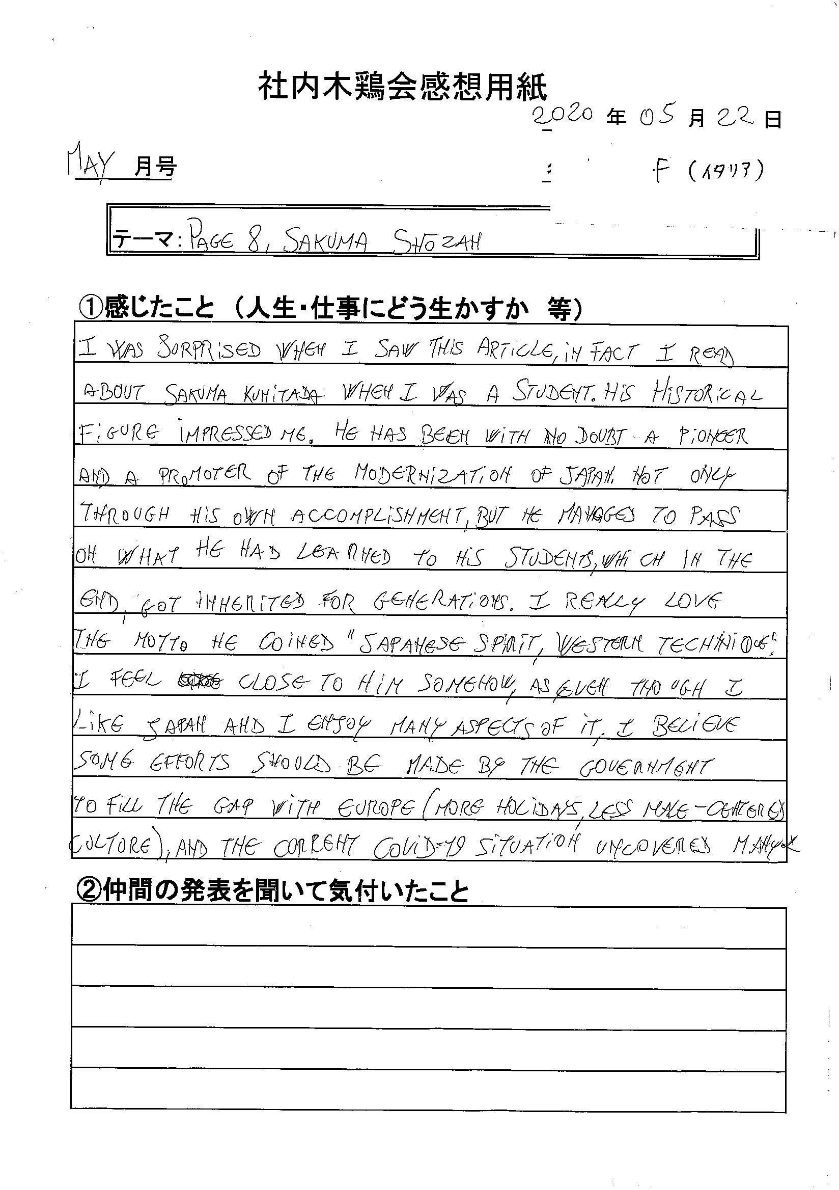 2020年8月の社内木鶏もこのコロナの影響で感想文のみの提出となりました。
