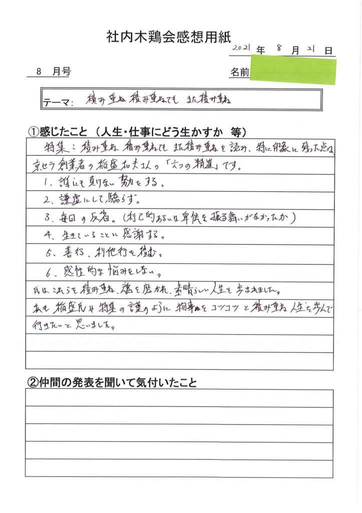 2021年社内木鶏会 8月のテーマは「積み重ね 積み重ねても また積み重ね」です。